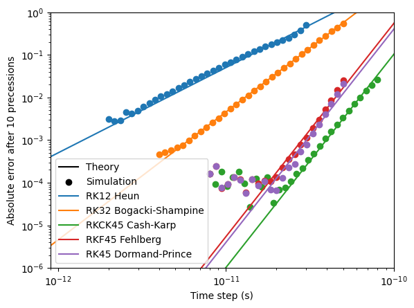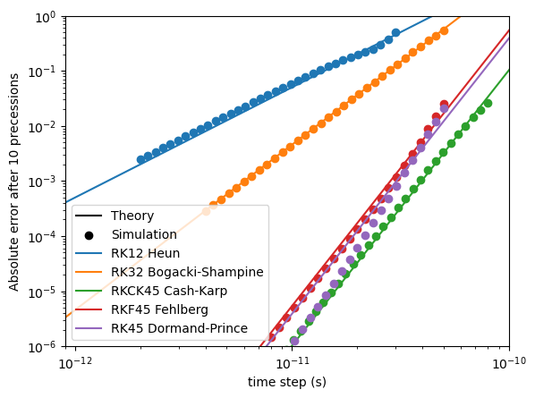 Below, we compare the numerical and analytical result of 10 precessions of one spin in an external magnetic field of 0.1 T, with damping. Depending on the time step, this results in a different error. The minimum attainable error is dependent on the floating-point precision used.